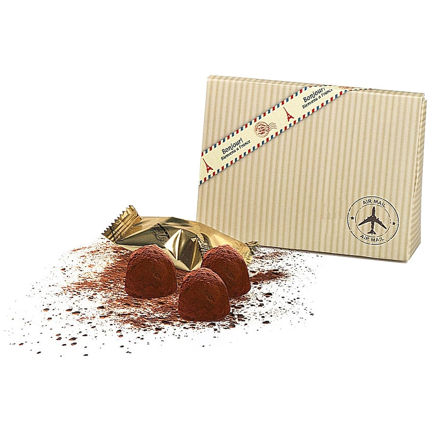 3 st chokladtryfflar i en pappkartong med eget tryck. Tryfflarna är producerade i Frankrike av förstklassig mörk choklad. Pappkartongen designas helt efter dina önskemål. En perfekt gåva till viktiga kunder!