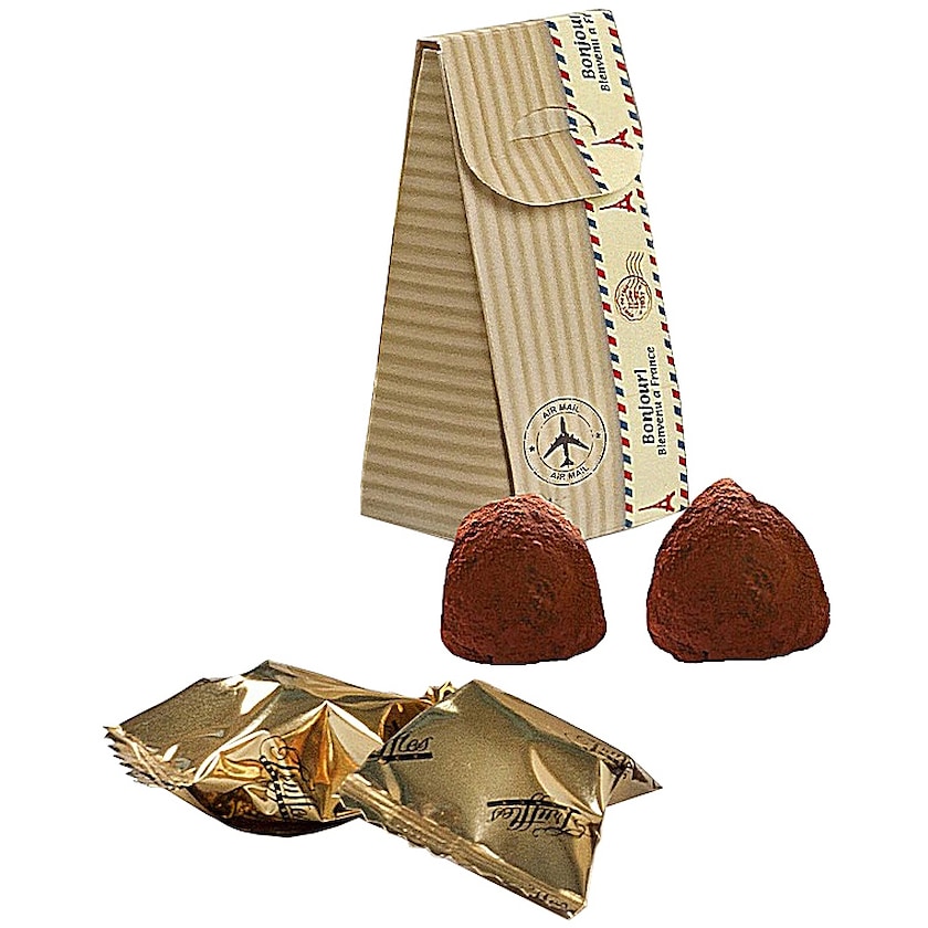 1 st chokladtryffel i en pappkartong med eget tryck. Chokladtryfflarna är producerade i Frankrike och är tillverkade av förstklassig mörk choklad. Pappkartongen trycks med digitaltryck och designas helt efter dina önskemål.