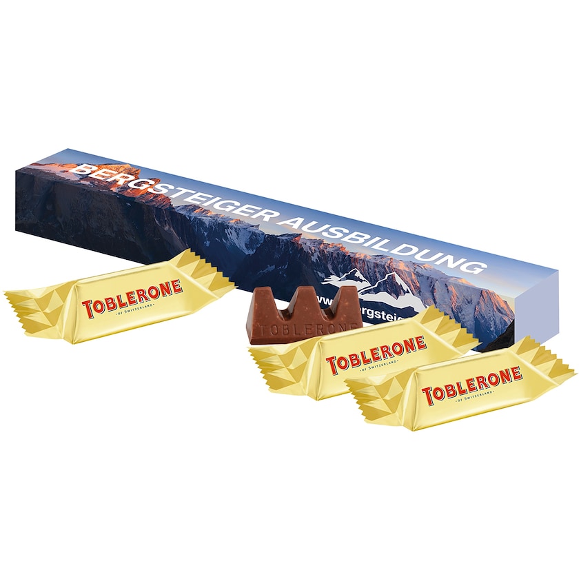 Pappask i egen design fylld med 3 st Toblerone Mini. En välsmakande present till kunder och anställda.