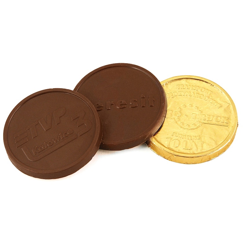 Chokladmynt med din logotyp präglat i chokladen. Myntet är tillverkat av finaste belgisk choklad. Välj mellan silver- eller guldfolie.