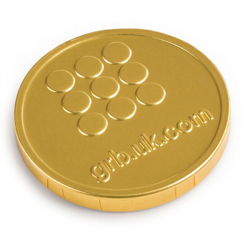 Chokladmynt med präglat motiv. Myntet har guldfolie och är fyllt med läcker mjölkchoklad. Som standard sker präglingen på ena sidan. Önskas prägling på båda sidorna tillkommer en extra startkostnad. Chokladmynten säljs i enheter om 3600 st. Alla barns favorit!