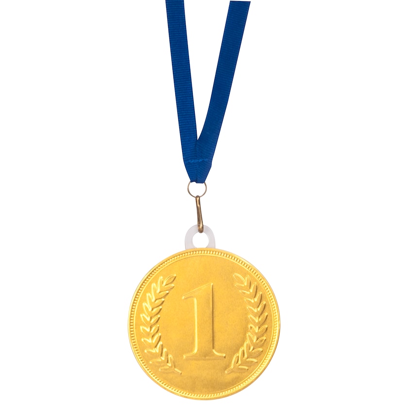 Chokladmedalj med guldfolie med en präglad etta. Chokladmedaljen är fäst vid ett band så att den kan hängas runt halsen på en värdig vinnare. Innehåller mjölkchoklad med minst 28% kakaohalt. Tack vare att chokladmedaljerna finns på lager är leveranstiden kort. Tryck eller ytterligare prägling är ej möjlig.
