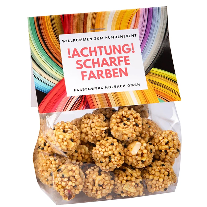 Stor påse med müslikulor med kort upptill med ditt tryck. Müslikulorna är gjord av quinoa, kokos, sesamfrön och solrosfrön och är kryddade med curry och en gnutta chilli. Ett hälsosamt alternativ till chips, godis och choklad.