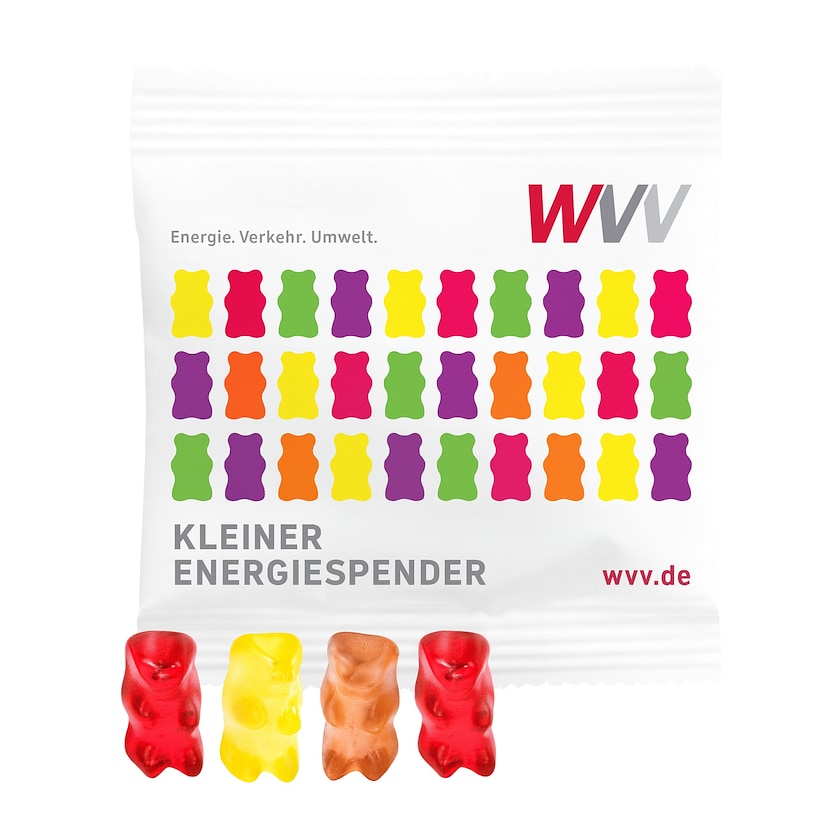 10 grams påse med gelébjörnar som går att beställas från endast 1000 st. Gelébjörnarna har läcker fruktsmak. Påsen trycks med digitaltryck helt efter dina önskemål. Förpackningen är i grunden gjord av vit plast. Perfekt för mässan, eventet eller utställningen!