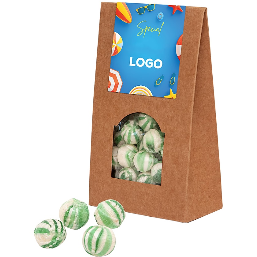 Naturfärgad påse med sockerfria karameller. Välj mellan smakerna mint och fruktmix. Trycket sker på en etikett som placeras upptill på påsen.