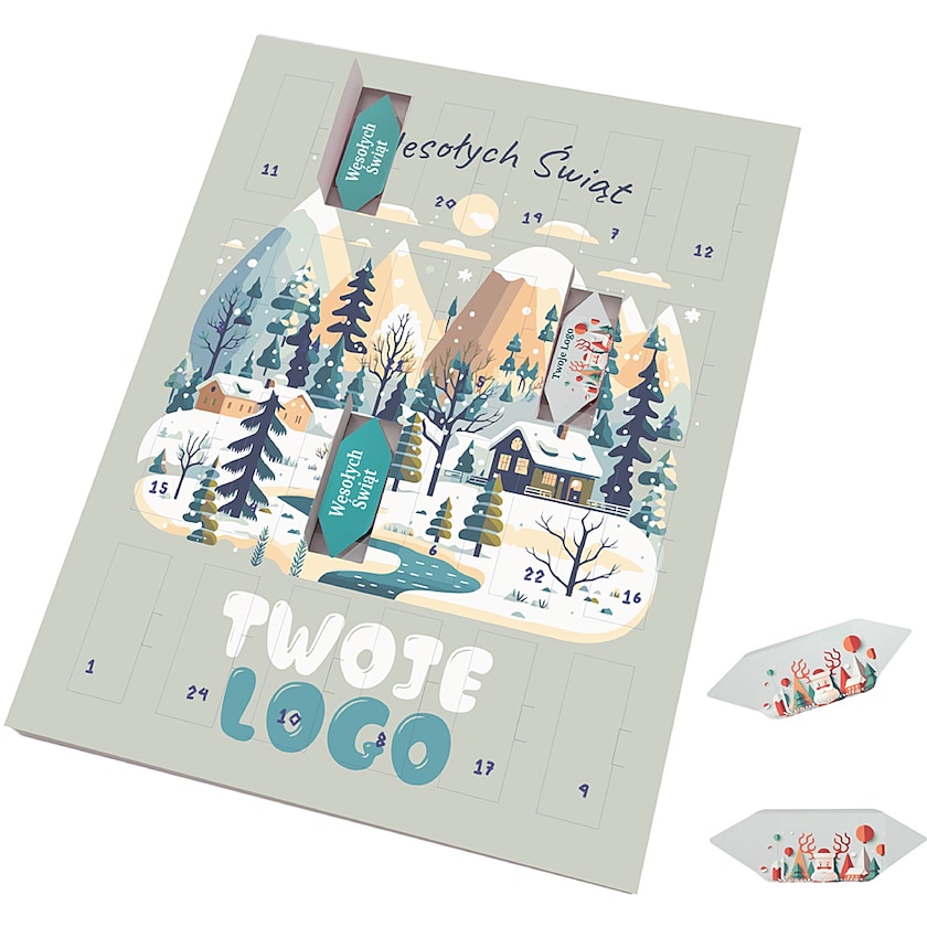Adventskalender med 24 st underbara fudge. Välj mellan smakerna mjölk och pepparkakskola. Både själva adventskalendern och pappret som omger fudgen förses med ditt tryck.