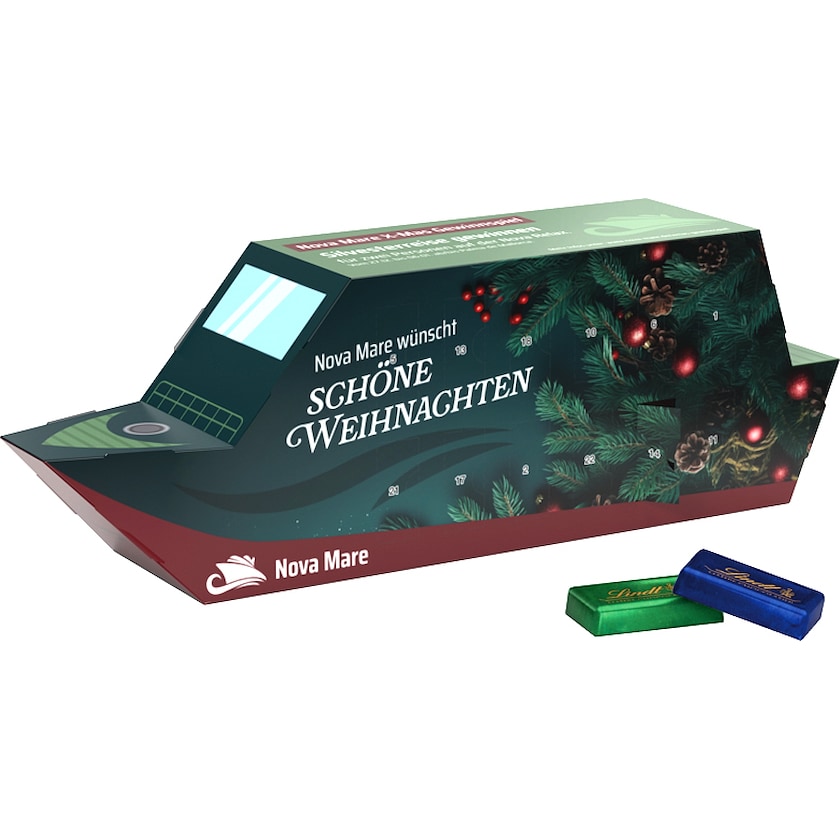 Adventskalender i form av ett fartyg fyllt med choklad från Lindt. Chokladen är av typen mjölkchoklad och kommer i tre olika foliefärger.