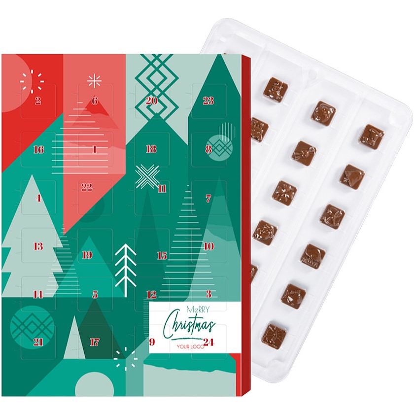 Digitaltryckt chokladkalender i ett lite mindre format. Adventskalendern innehåller 24 st chokladbitar i antingen mörk choklad eller mjölkchoklad.