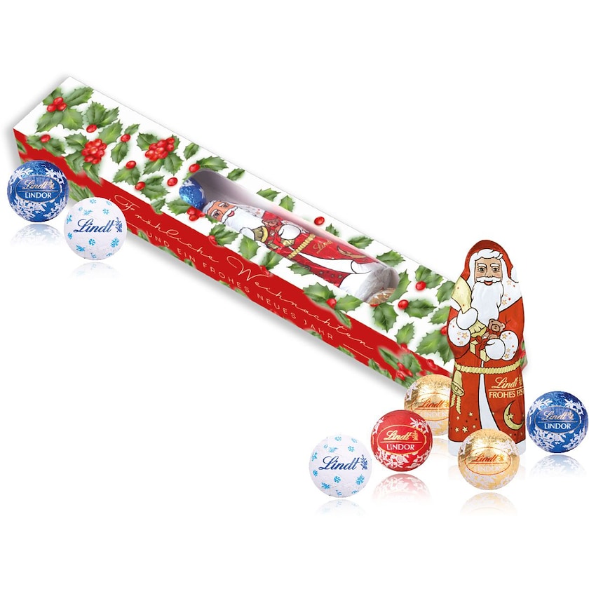 Chokladkartong med praliner och chokladtomte från Lindt. Lindt Christmas Parade innehåller 5 st Lindt Minis (ca 22 gram) samt 1 st Lindt Chokladtomte (ca 10 gram). Kartongen trycks helt efter dina önskemål.