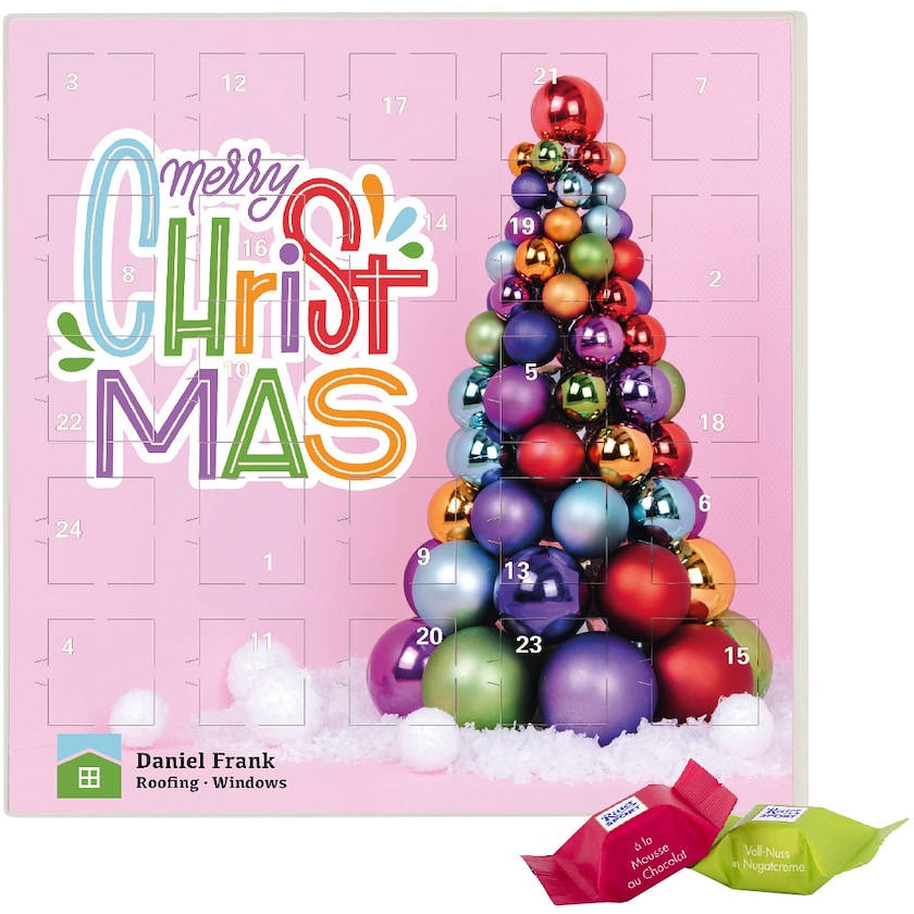 Kvadratisk adventskalender med choklad från Ritter Sport. Adventskalendern innehåller 24 st Ritter Sport chokladkuber. Inlagan är komposterbar och hela produktionen har skett 100% klimatneutralt.