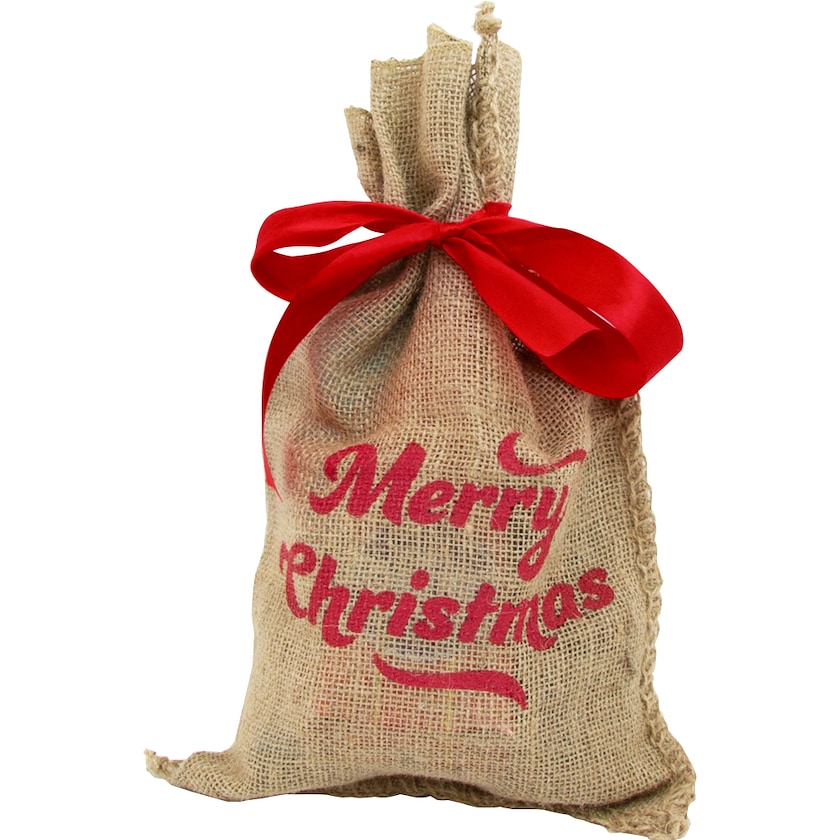 Liten jutesäck med "Merry Christmas" tryckt i rött. Innehåller saffransmandel, mjölkchokladchips, chokladtryfflar, marsipanpraliner och skumtomtar. Julsäcken är försluten med en röd rosett. Kan kompletteras med hälsingskort.