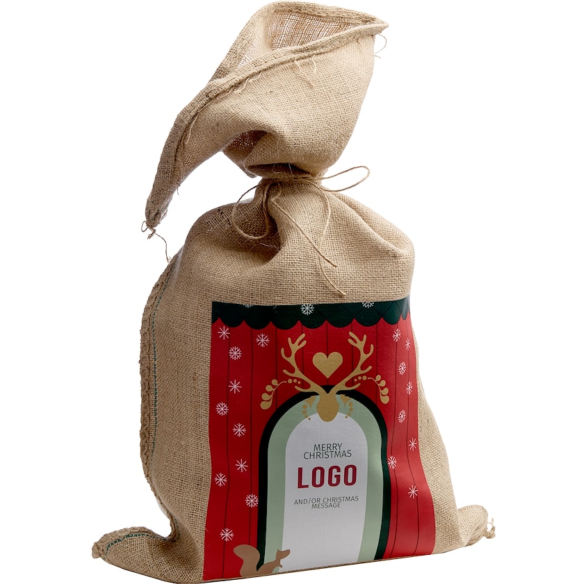 Stor julsäck av jute fylld med valfritt julgodis. Julsäcken förses med ditt tryck. Välj mellan italiensk pralinmix, chokladragerad kolamix, julskum och mixad julkola.