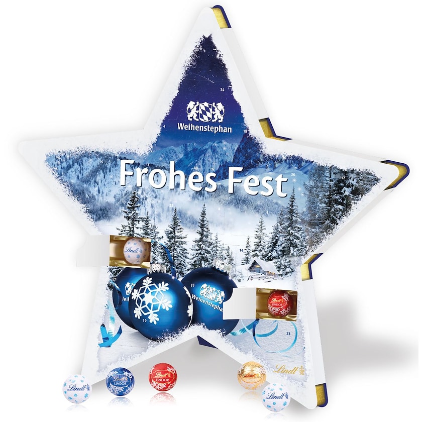 Miljövänlig adventskalender med tryck som är formad som en stjärna. Adventskalendern innehåller 24 st utsökta Lindt Minis. Kartongen är FSC-certifierad och inlagan är biologiskt nedbrytbar. Hela produktionen har skett klimatneutralt. Hela adventskalendern trycks efter dina instruktioner.