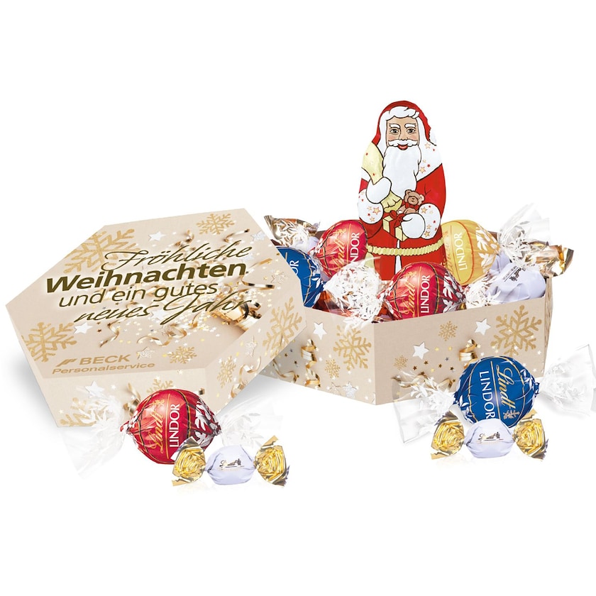 Chokladkartong med lyxig choklad från Lindt. Lindt Christmas Maxi Box innehåller 5 st Lindt Lindor, 5 st Lindt mjölkchokladkulor samt 1 st Lindt jultomte. En perfekt julgåva till viktigare kunder. Hela kartongen trycks efter dina önskemål.