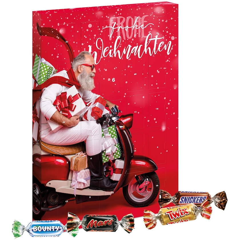 Chokladkalender fylld med Mars, Snickers, Bounty och Twix. En härlig chokladmix som älskas av alla! Hela kalendern trycks efter dina önskemål.