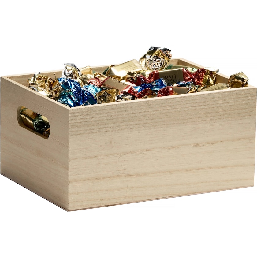 Liten trälåda fylld med 1 kg lyxig italiensk pralinmix. Ett julkort med egen julhälsning ingår i priset.