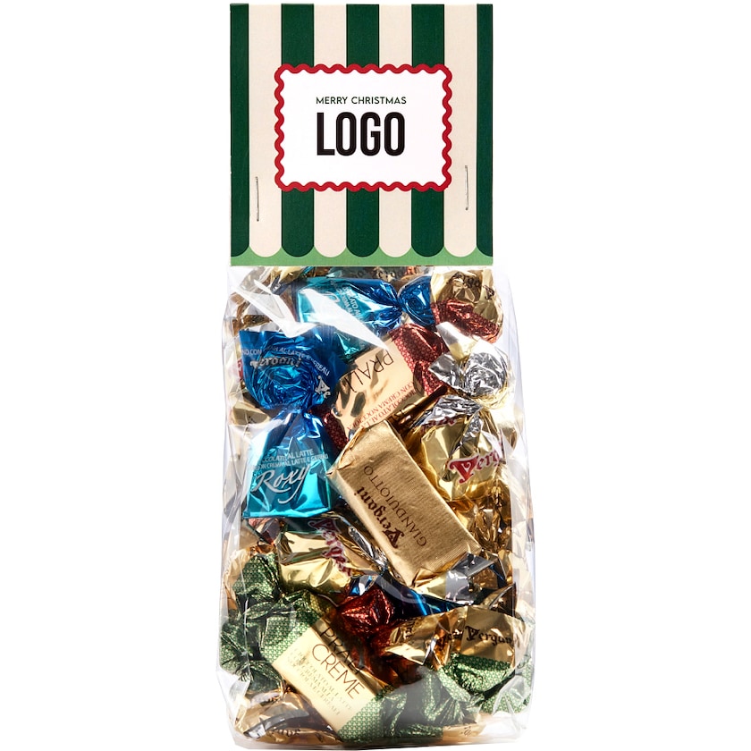 Påse fylld med olika typer av julgodis. Pappersryttaren trycks efter dina önskemål. Välj mellan italiensk pralinmix, chokladragerad kolamix, julskum och mixad julkola. En uppskattad julgåva till kunder och medarbetare.