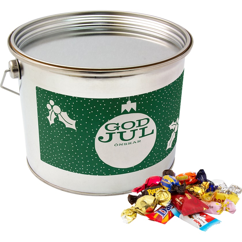 Plåthink med välkänt kvalitetsgodis. Innehåller t ex Dumle, Fazer Blå, Snickers, Mars, Twix och Engelsk kola. digitaltryckt etikett ingår på burkens sida. Välj ett färdigt eller skapa ett eget motiv!