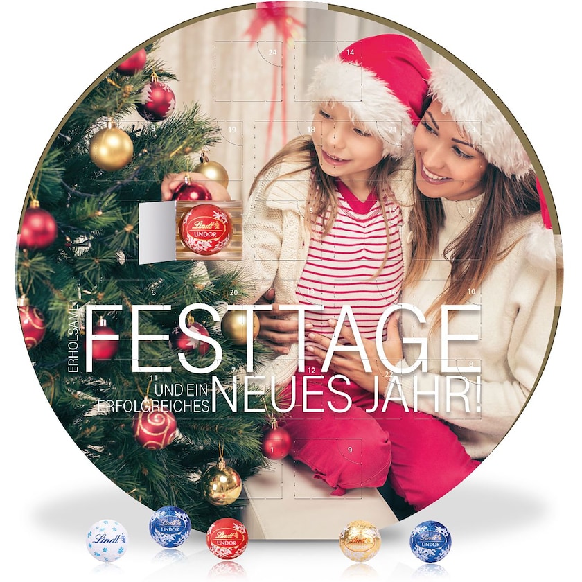 Rund adventskalender fylld med 24 st Lindt Minis. Adventskalendern är tillverkad av FSC-certifierad kartong som tillverkats helt klimatneutralt. Ladda ner tryckmallen och skapa din unika adventskalender.