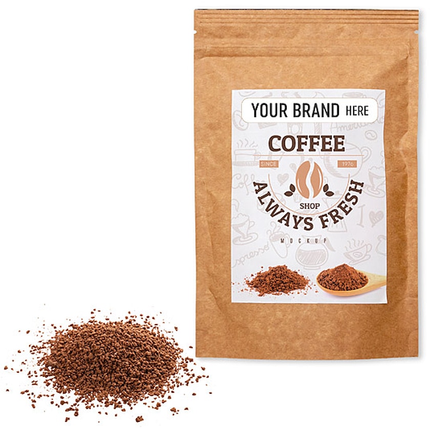 60 gram högkvalitativt snabbkaffe i naturfärgad påse. En etikett med ditt tryck placeras på påsens framsida.