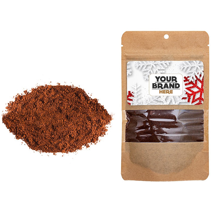 50 gram malt kaffe av hög kvalitet. Kaffet består av en utsökt blandning av Arabica- och Robusta-bönor. Levereras i en naturfärgad påse med fönster. En klisterdekal med ditt tryck placeras på påsens ena sida.