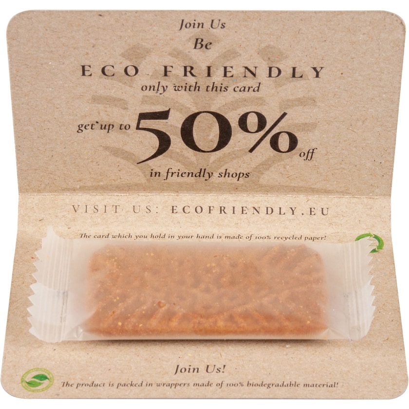 Läckert kex med karamellsmak fäst på ett naturfärgat pappkort. Kexet är förpackat i en biologiskt nedbrytbar förpackning. Pappkortet är perforerat så att den lätt kan rivas av och användas som t ex en rabattkupong.