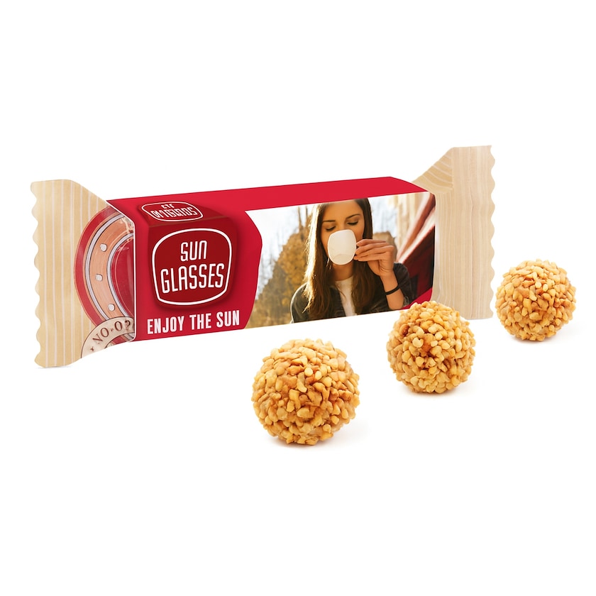 3 st underbara hasselnötskulor från Giotto. Trycket sker på en papphylsa som träs runt originalförpackningen.