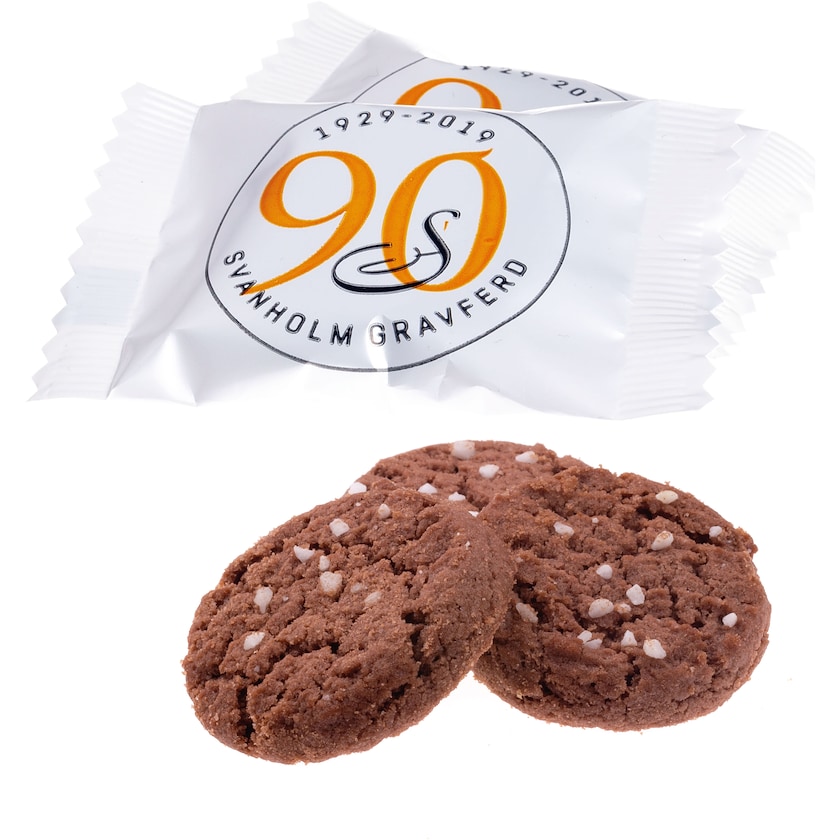 En småkaka från Nyåkers i flowpack med tryck. Välj mellan smakerna gräddkola eller choklad. Ett perfekt mellanmål.