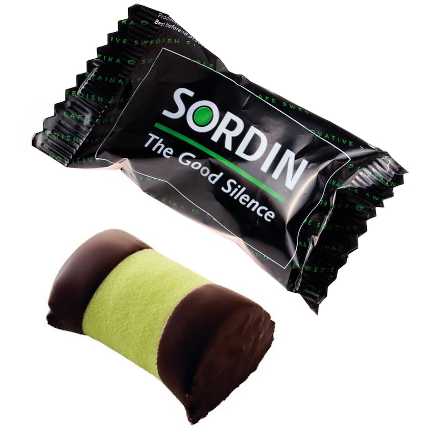Liten punschrulle i förpackning med tryck. Punschrullen är täckt av marsipan med arrakssmak toppad i choklad. Hela förpackningen trycks efter dina önskemål.