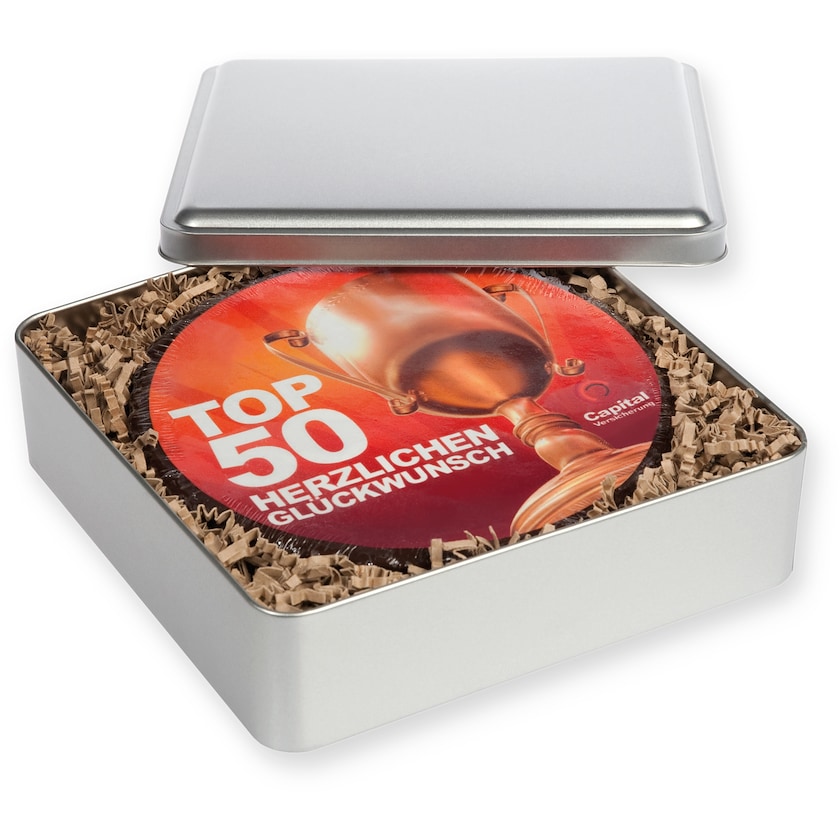 Stor chokladtårta med tryck på ovansidan. Hela tårtans ovansida trycks med full fotorealism helt efter dina önskemål. Levereras i en exklusiv metallåda.