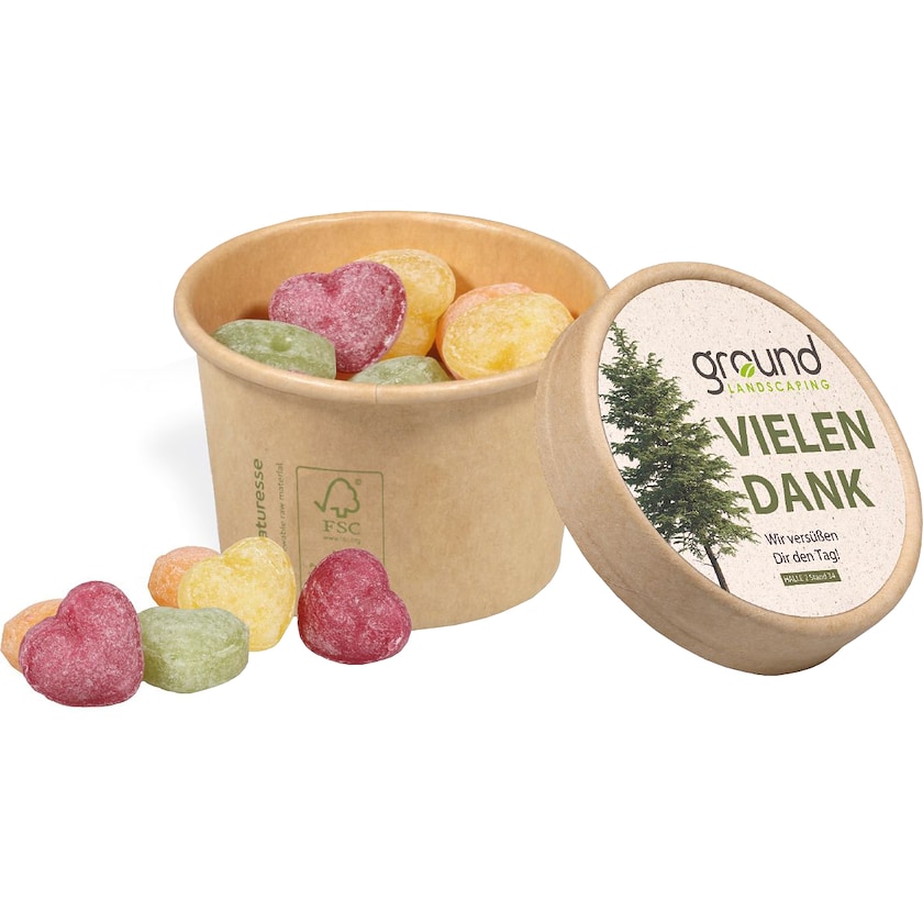 Karameller gjorda av råvaror av högsta kvalitet. Välj mellan sex olika smaker. Karamellerna är tillverkade av Edel som är en godistillverkare från Bayern. Trycket sker på en rund pappbricka som placeras på locket. Burken är tillverkad av FSC-certifierat papper.
