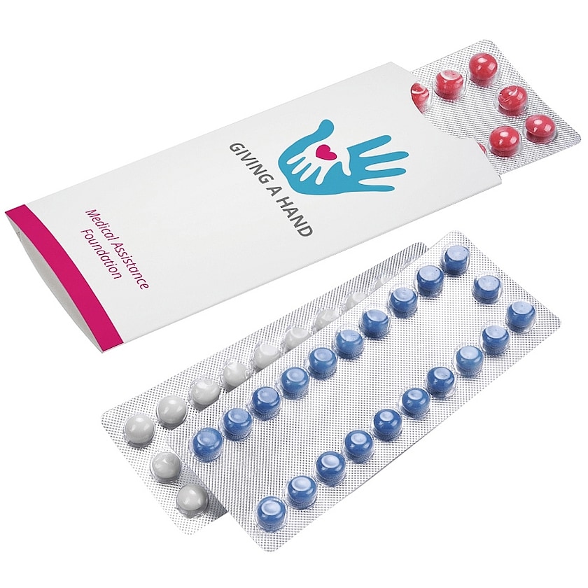 21 st blisterförpackade pastiller i papphylsa med eget tryck. Hela papphylsan trycks med digitaltryck. Kan fås i flera härliga smaker.