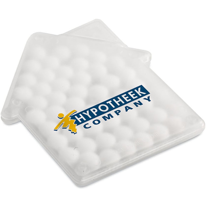 Kul husformad ask i vistikortstjocklek som är fylld med ca 50 sockerfria mintpastiller.