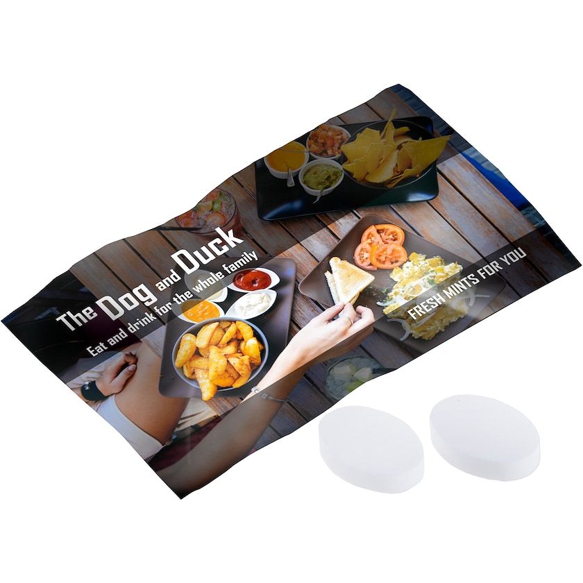 Stor förpackning med två sockerfria minttabletter. Förpackningen digitaltrycks och tack vare det stora formatet finns det gott om plats för ditt reklambudskap.