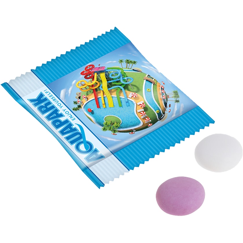 Två Mentos i en flowpack med ditt tryck. Välj mellan Mentos i smakerna mint och fruktmix. Hela flowpacken trycks efter dina önskemål.