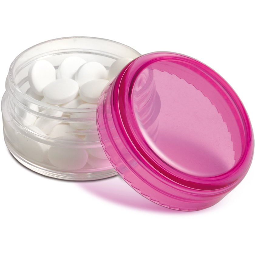 Burk med ca 12 gram sockerfria minttabletter med pepparmintssmak. En unikt godisburk som ger bra reklam till en liten kostnad.