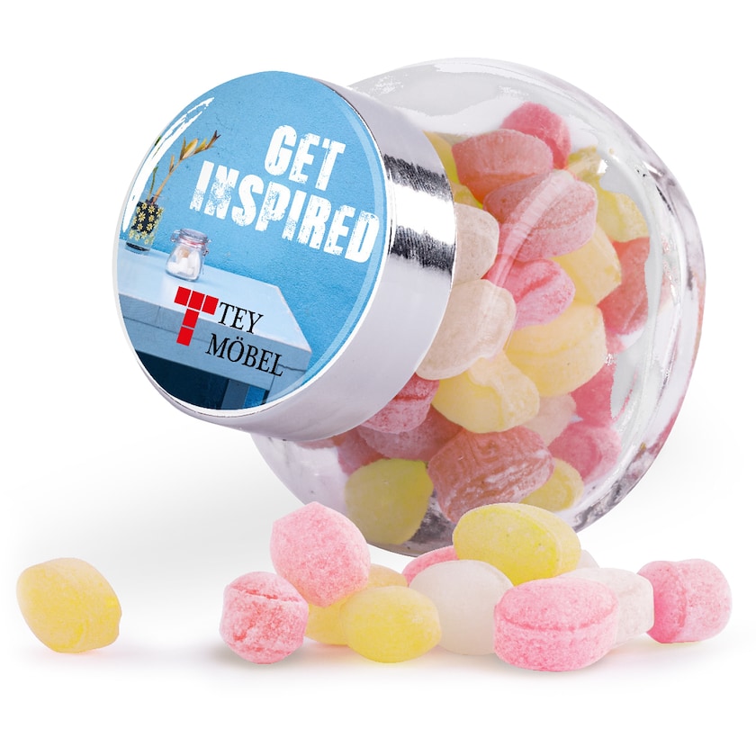 Liten godisburk med stor wow-effekt! Godisburkens lock förses med en digitaltryckt domingetikett med ditt tryck. Karamellerna har blandade smaker och är producerade i Tyskland.