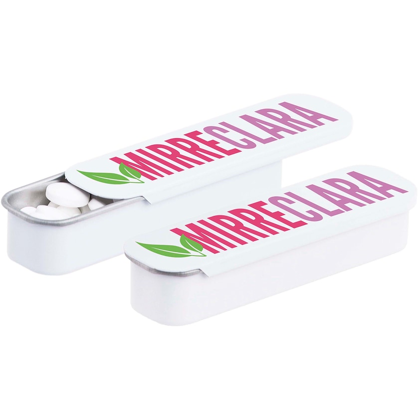 Plåtask med 11 gram uppfriskande minttabletter. Välj fritt mellan sockerfri och vanlig mint. Trycket sker på askens lock.
