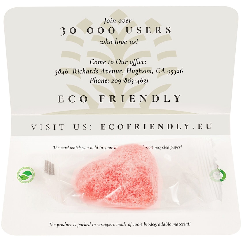 Ett geléhjärta fäst på ett pappkort. Geléhjärtat är förpackat i en 100% biologiskt nedbrytbar förpackning. Pappkortet är perforerat så att den lätt kan rivas av och användas som t ex en rabattkupong.