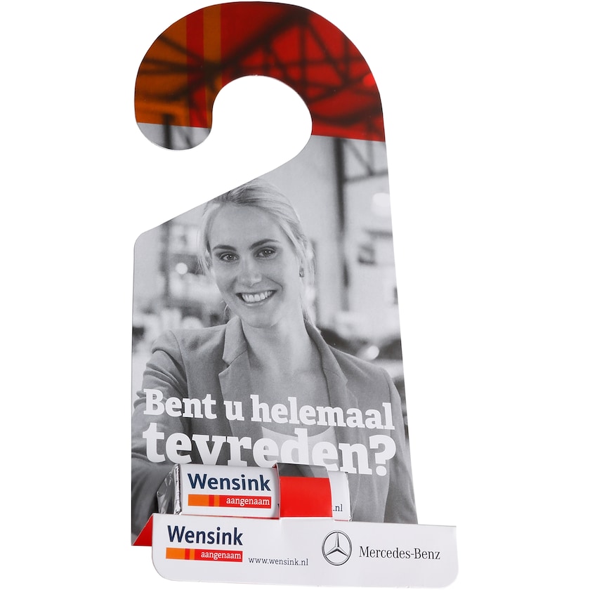 Mintförpackning fäst på hängare för backspegeln. Perfekt för bilhandlaren! Hängaren är tillverkad av papp och digitaltrycks helt efter dina önskemål. Detsamma gäller mintförpackningen. Tabletterna har hela 36 månaders hållbarhet.