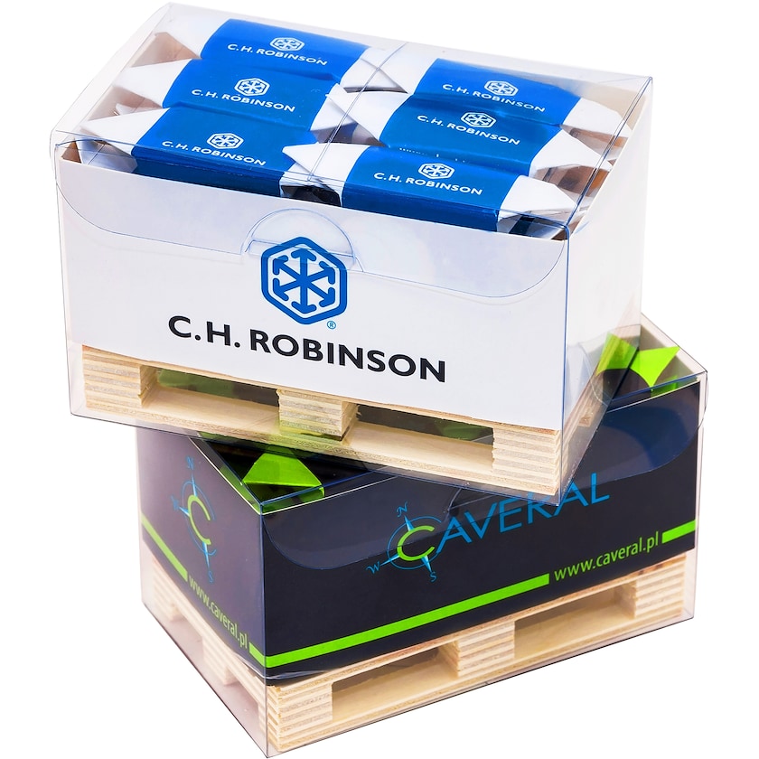 Kul set med 24 fudge på en EUR-pall i miniformat. Fudgen är tillverkade enligt traditionellt recept och har underbar smak. Fudgens pappförpackning trycks med digitaltryck liksom pappbanderollen som går runt EUR-pallen.