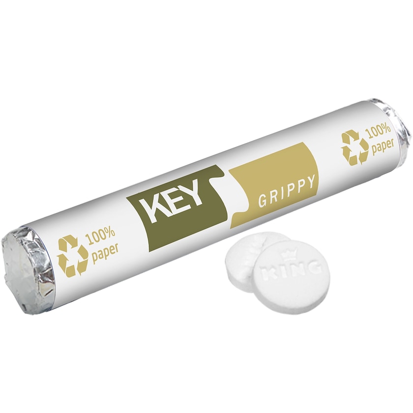 Rulle fylld med uppfriskande tabletter med pepparmintsmak. Rullens papper är framställt av återvunnet papper. En trevlig gåva på mässan eller eventet.