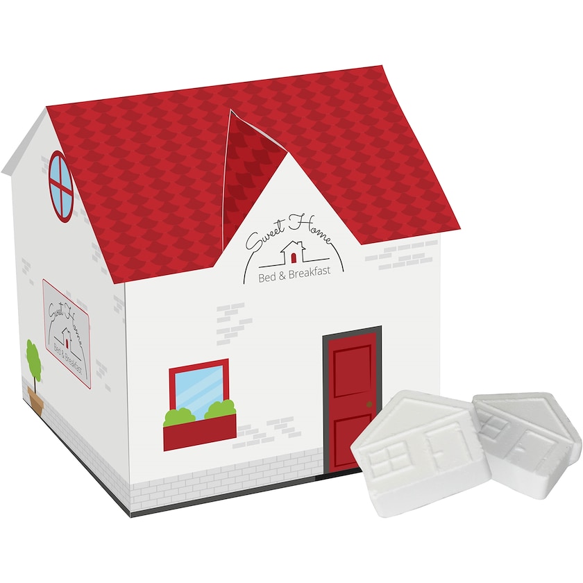 45 gram minttabletter i ett hus av papp. Huset trycks helt efter dina önskemål. Ladda ner tryckmallen och skapa din egen design.