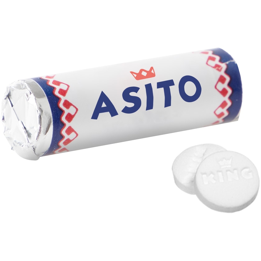 Liten rulle fylld med 9 st uppfriskande minttabletter. Hela pappret som omsluter rullen trycks efter dina önskemål.