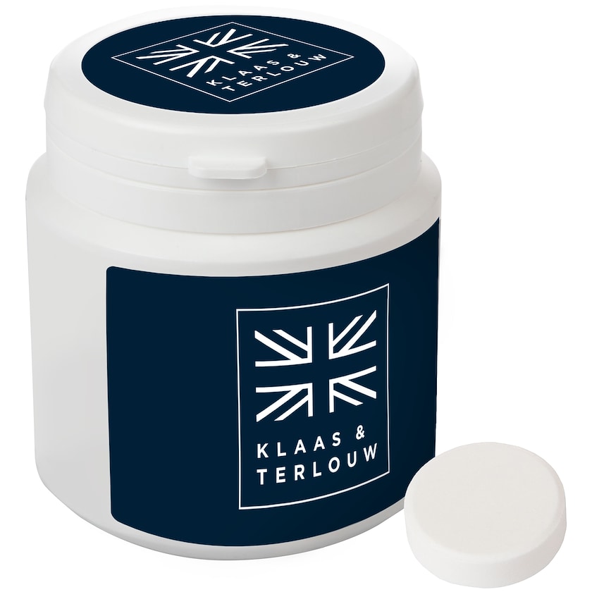 Burk fylld med 160 gram minttabletter. Etiketter med ditt tryck placeras på burken samt burkens lock.