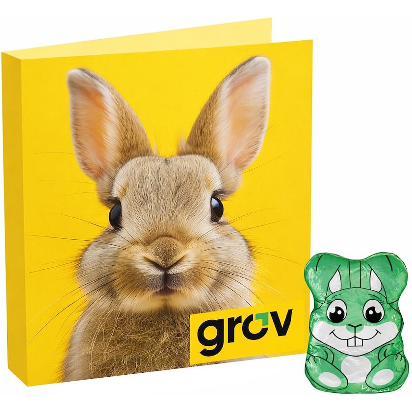 Vegansk chokladhare av Fairtrade-certifierad choklad. Chokladharen fästs på kortets insida. Hela kortet trycks efter dina instruktioner.