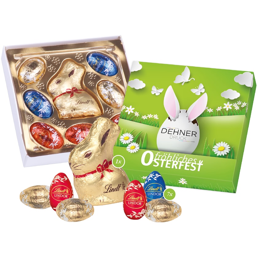 Chokladask fylld med påskchoklad från Lindt. Överraska dina kunder! Chokladasken är tillverkad av klimatneutralt och FSC-certifierat papper och innehåller 42 grams förstklassig choklad.