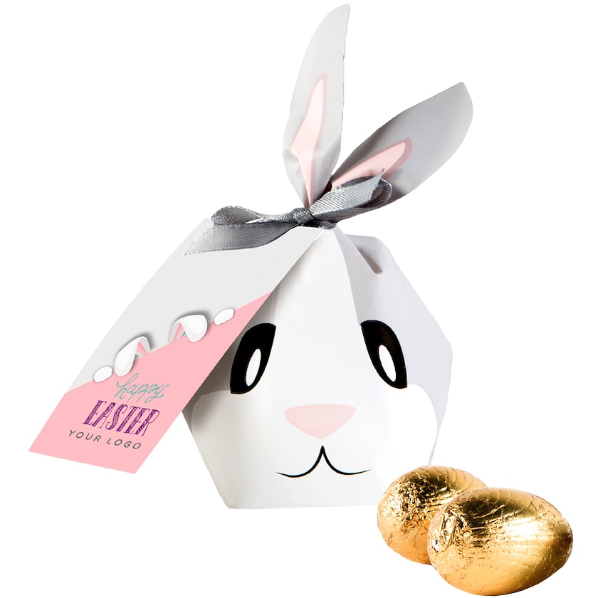 Påse designad som en gullig hare som är fylld med 5 st chokladägg. Chokladäggen är inslagna i guldfärgad folie och väger totalt 50 gram. Påsen är försedd med ett pappkort vars framsida trycks helt efter önskemål.