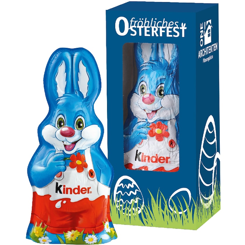 Harry the Bunny från Kinder i förpackning med ditt tryck. En favorit bland stora och små barn! Förpackningen är tillverkad av FSC-certifierad papper som har producerats klimatneutralt. Ladda ner tryckmallen och skapa din unika påskchoklad!