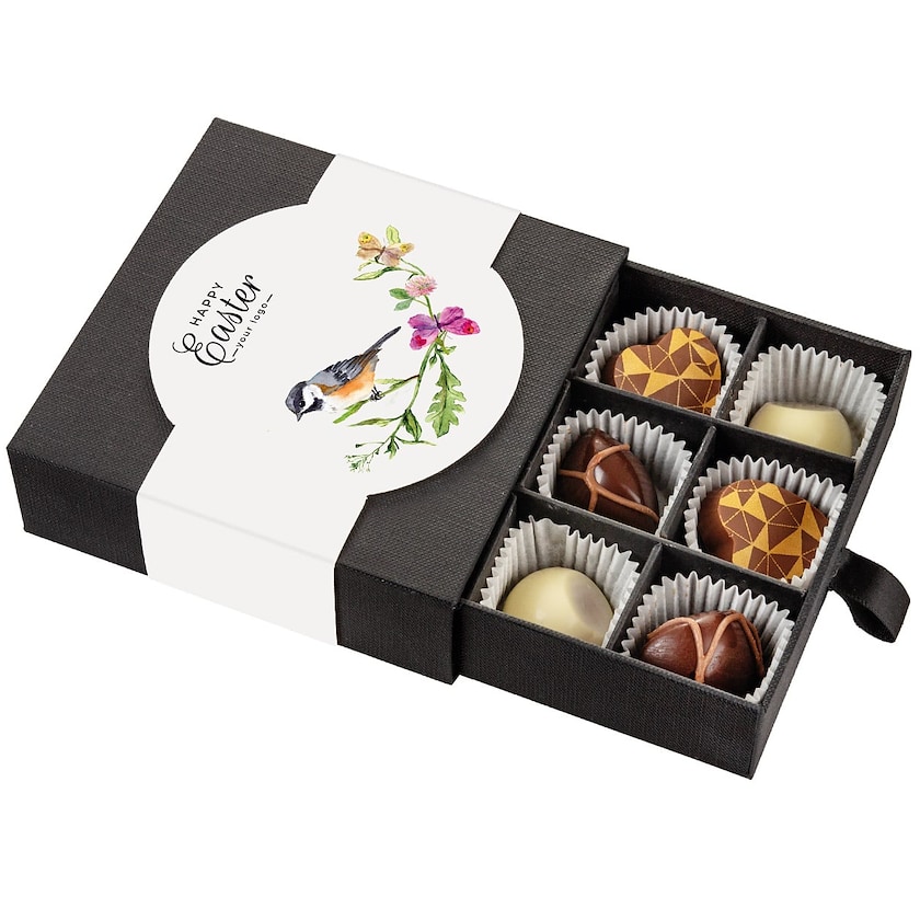 Lyxig chokladask med 9 praliner. Pralinerna är av högsta kvalitet och väger totalt 63 gram. Ett perfekt val för dig som söker en chokladask med lyxig påskchoklad. Trycker sker på askens banderoll.